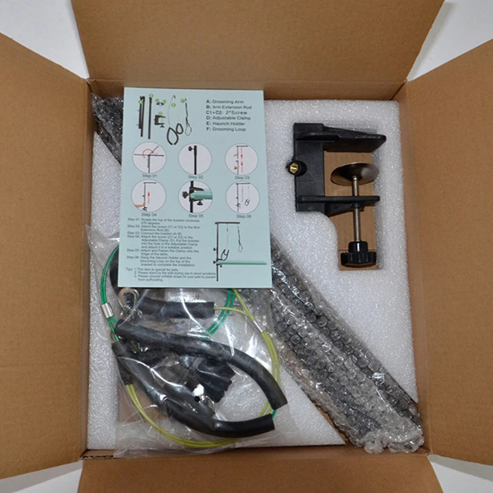 - Sturdy metal construction with a foldable grooming bracket and telescopic table hanger for you to use securely during baths, trims, and drying.