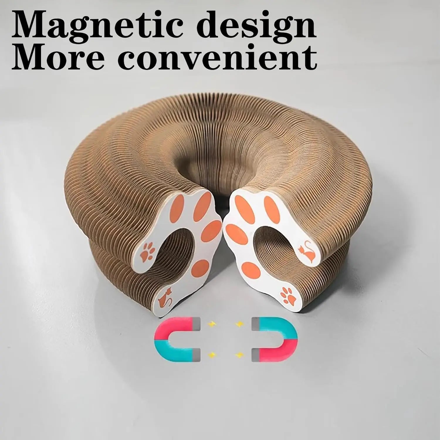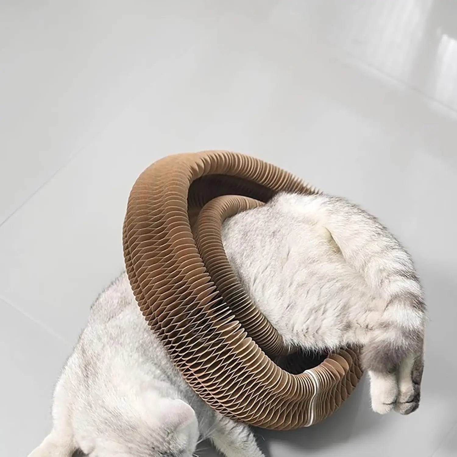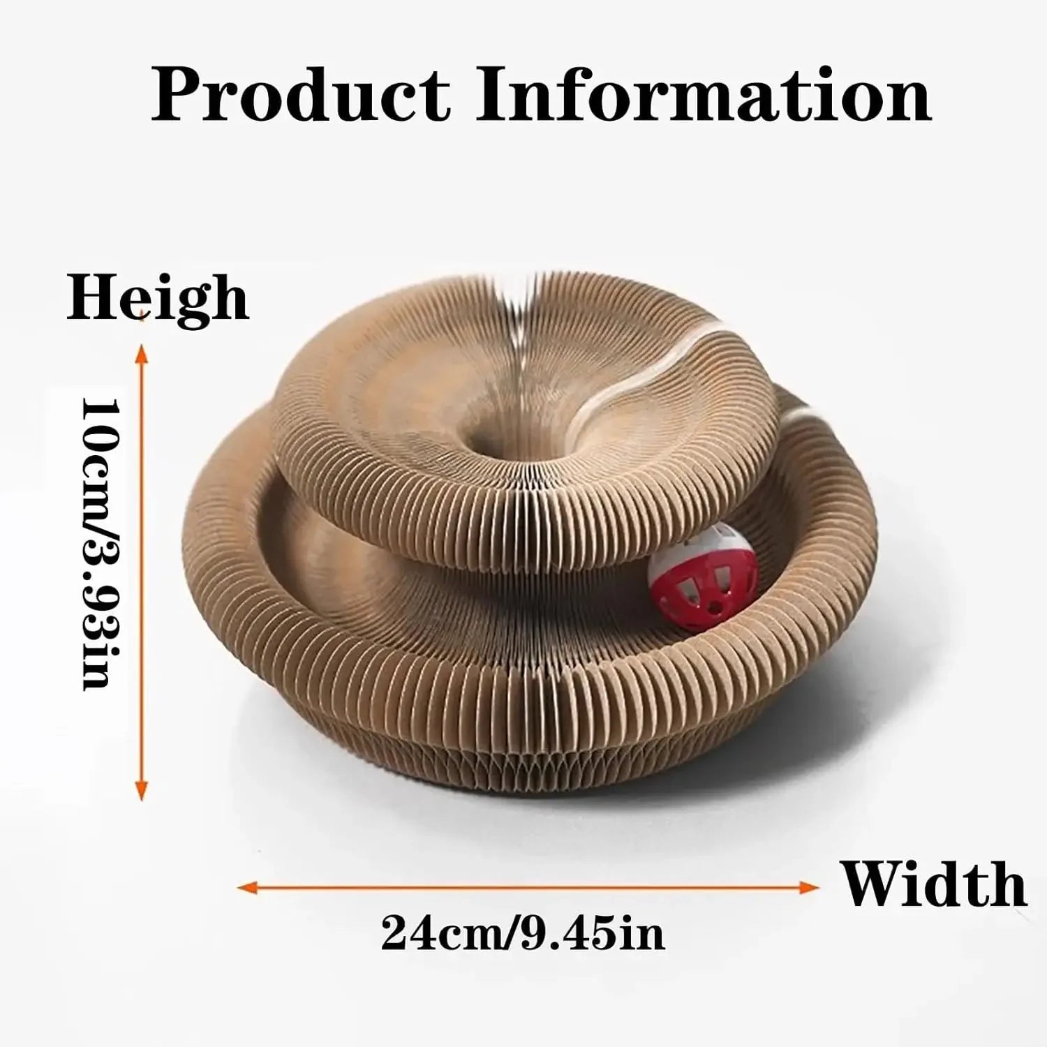 Kitty Kurlz Cat Toy is a accordion-style foldable cat scratch board toy with bell, offers transformative joy, durable construction, and is an interactive toy that fulfills cats' natural scratching urge.